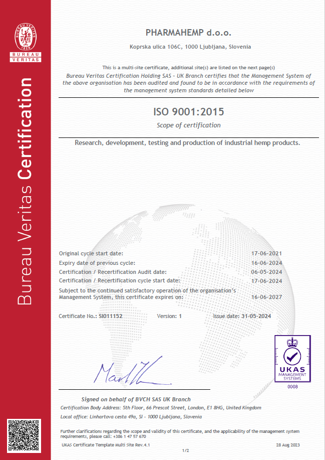 • Certificate related to ISO 9001:2015 for research, development, testing and production of industrial hemp products by Bureau Veritas since June 2021