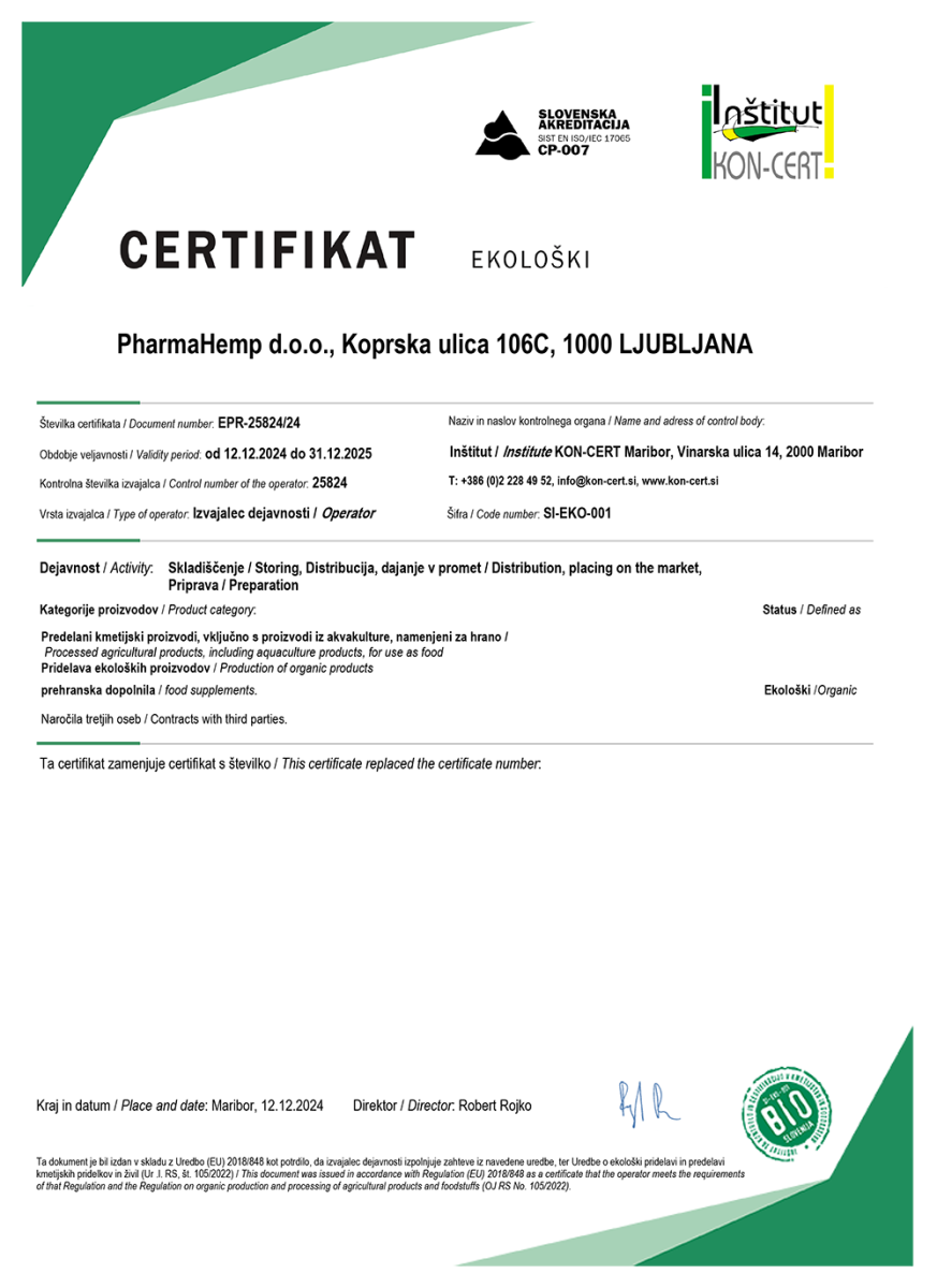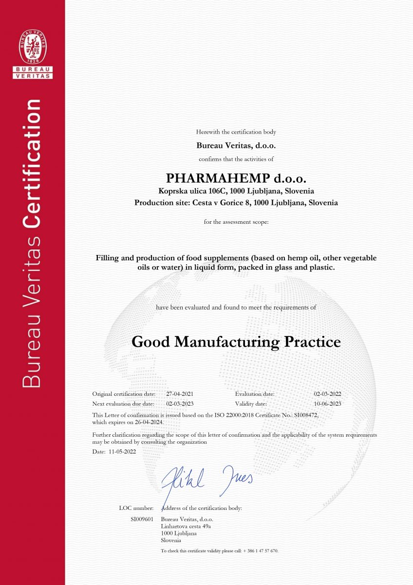• GMP certificate for filling and production of food supplements (GMP 3:2014) by Bureau Veritas since April 2021