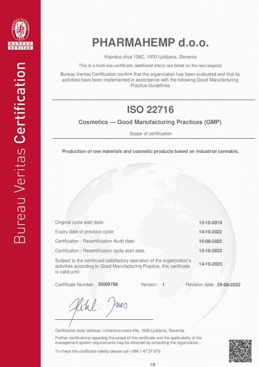 • GMP certificate according to ISO 22716:2007 for production of raw materials and cosmetic products based on industrial cannabis by Bureau Veritas since October 2019